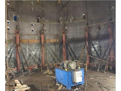 一切正常后,就可将提升架底板与罐底板焊牢。至此,液压提升设备的安装、就位即完成。当拱顶罐的二层壁板纵向焊缝焊接完成后,提升工作就可以进行了。